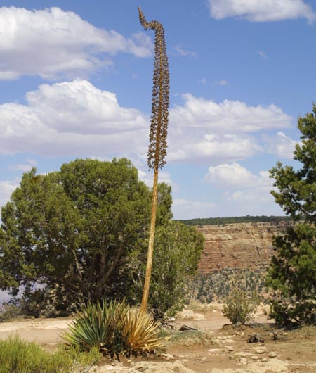 | A yucca plant. These succulents live for years, gathering and storing up resources, so that they can bloom, sending a stalk up several feet. The stalk can grow up to several inches each day. After sending up the stalk, and blooming, the plant is able to breed, and then die. | |