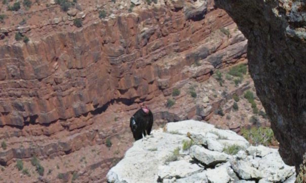 | This is a California Condor perching on some rocks just below the canyon rim. Conservationism aside, these are not pretty birds. They are carrion eaters, essentially vultures, which cruise the sky looking for carcasses on which to feed. | |