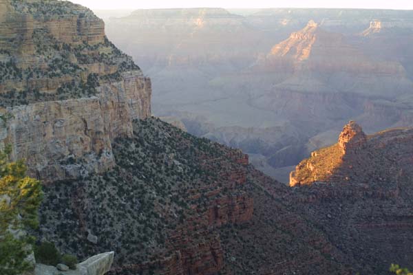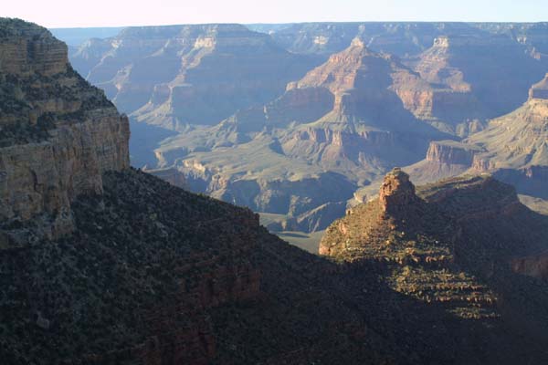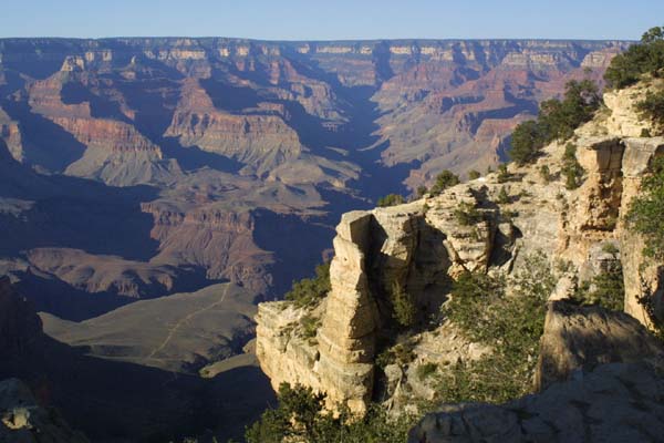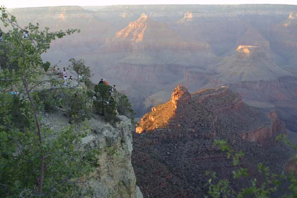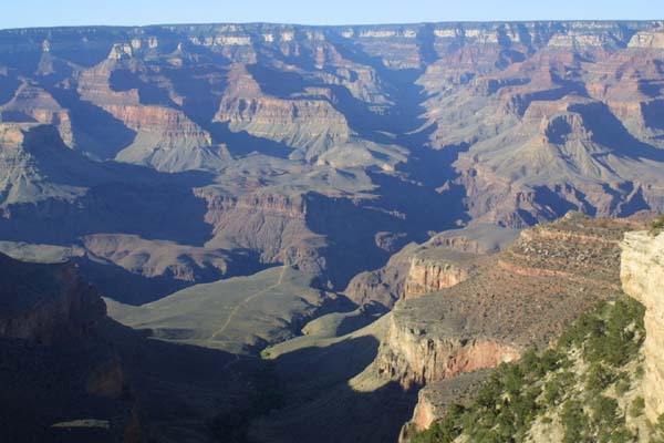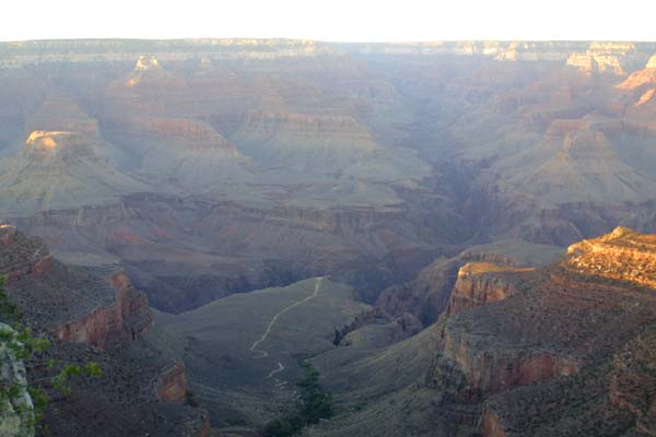 The lower areas of the canyon are now in shadow, giving hikers and