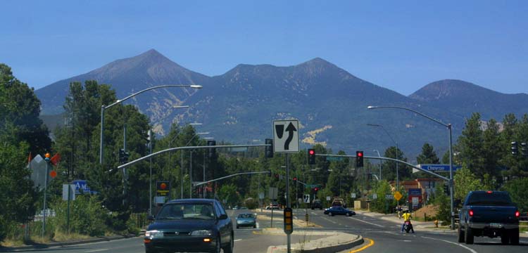 | The size, and sprawl of Flagstaff is constrained by the surrounding mountains. The downtown area is pretty much at the mountain base. | |