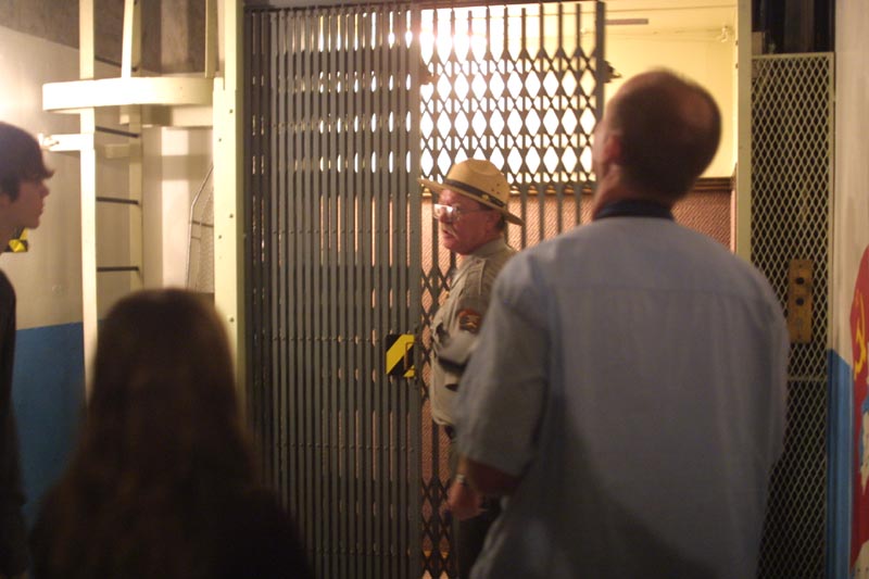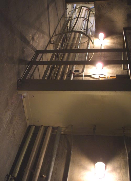 begin our descent. The shaft is ten feet square, and the elevator itself