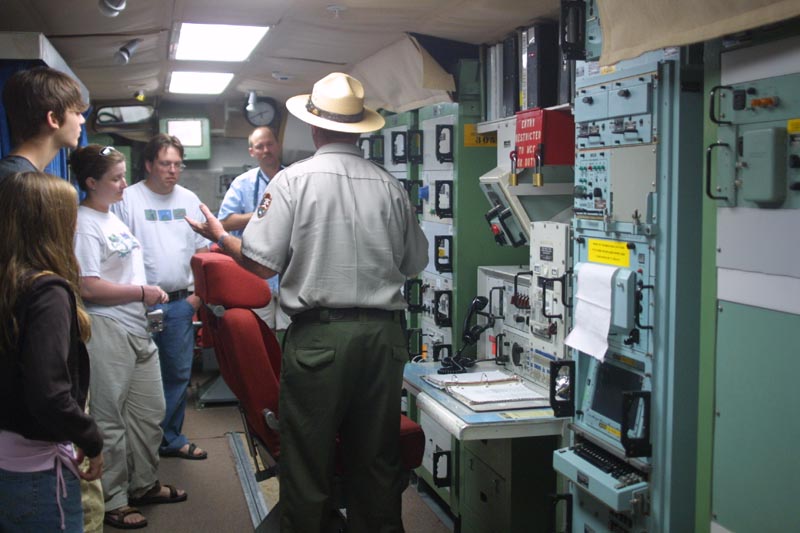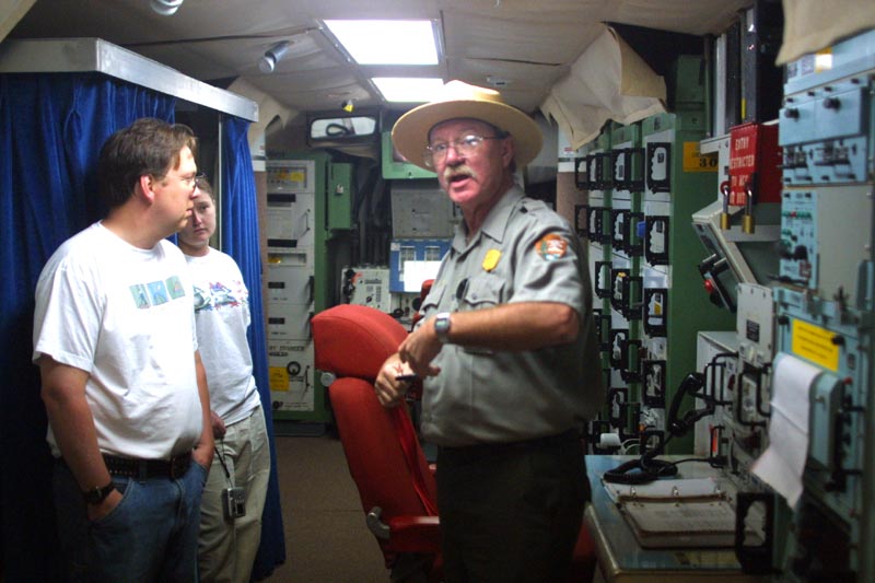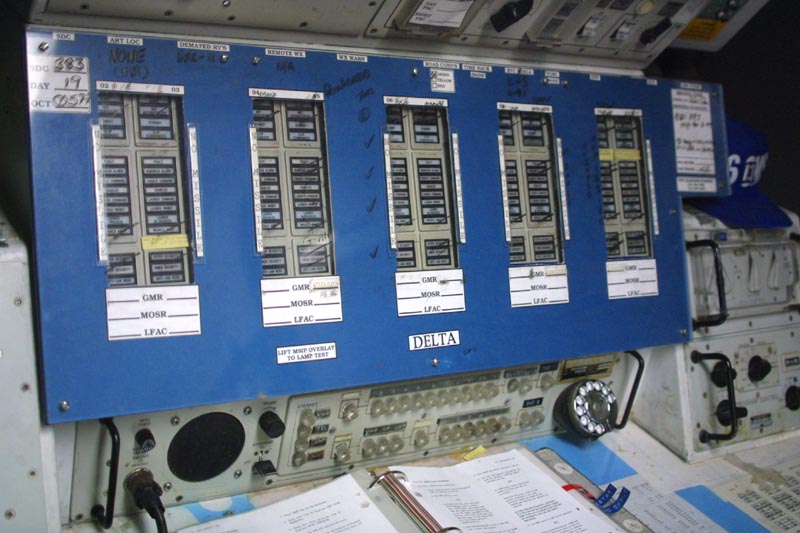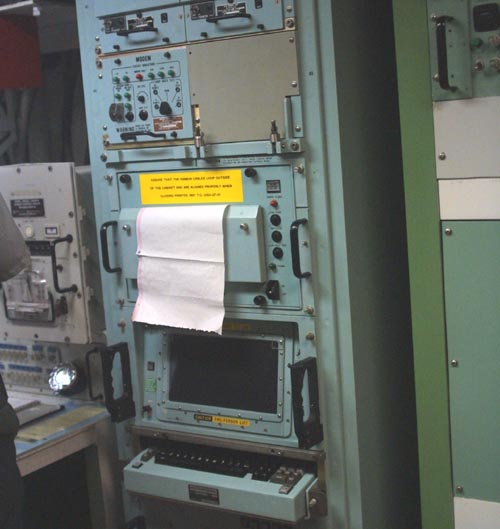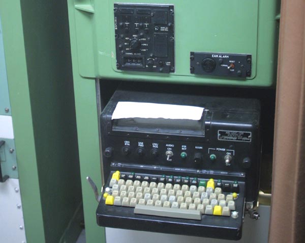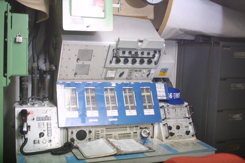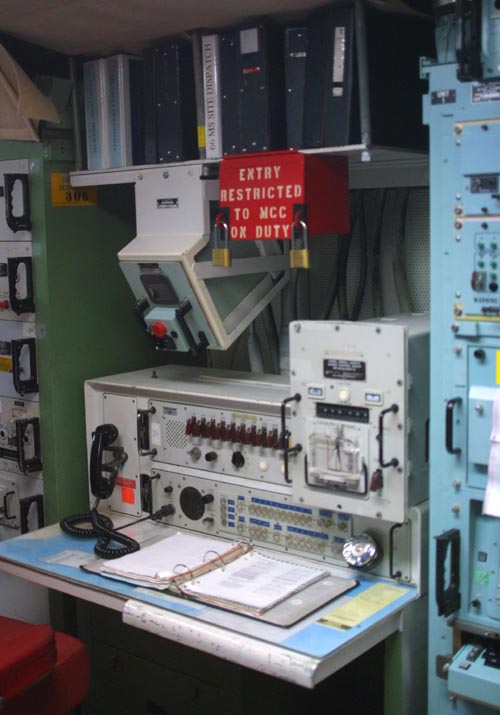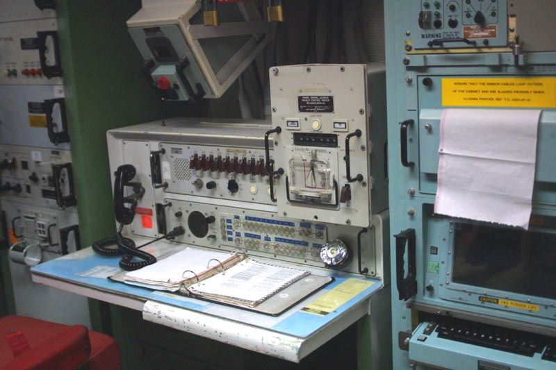 The red box next to the SLFCS, is the safe. It is where the codes are kept, and also where the extra ammunition for the revolvers arming the launch officers is kept. It is secured by two padlocks; each launch control officer has the combination to one. On the shelf above are procedures, operating manuals, and codes. |
