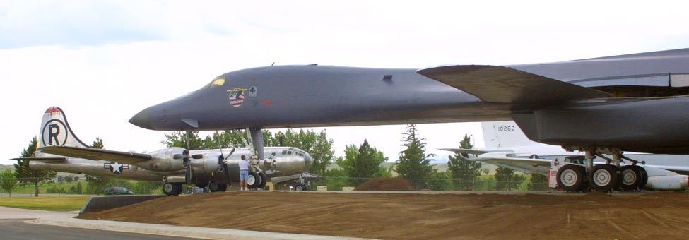 | Above: The above photo shows our newest Nuclear bomber, the B-1, with our oldest nuclear bomber, the B-29 in the background. Left:: The tail end of the B-1. These aircraft can carry huge bomb loads, very long distances, and have a very small radar signature. The original design was supersonic, and very high flying. Today's new B-1 flys very low, and just a bit under mach -1. This is in recognition of today's more effect anti aircraft armament. Below: The B-1, and the Minuteman |