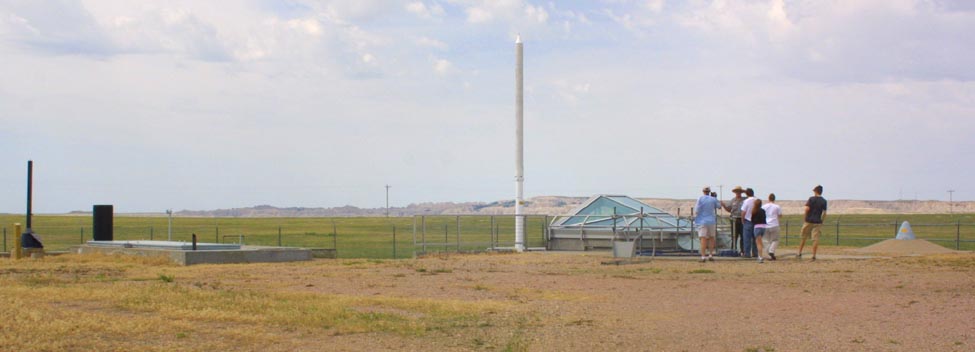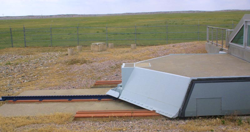 | Left: The silo cover has been pushed back, a foot more than half way, and permanently fixed in place. An observation window was then built over the silo. The silo cover weighs over 30 tons. Below: A view down the silo, through the greenhouse. to the left of the photo can be seen access openings for servicing the missile. |