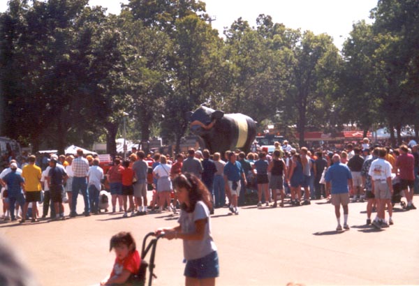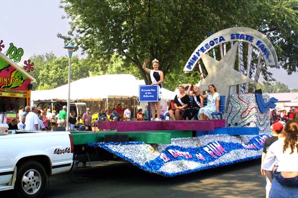| Left: The queen of the fair waves at us from her float. Below: Riding around in the trashmobiles. |