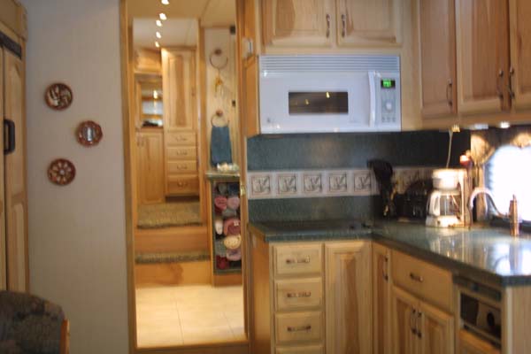 kitchen. The steps leading to the back bedroom can be seen through the passage.