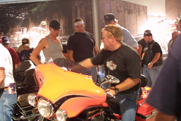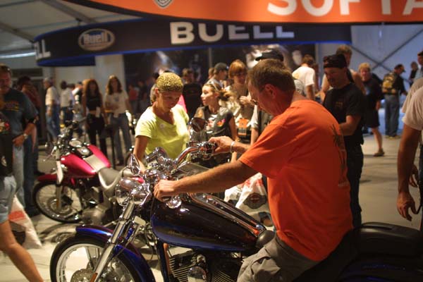 | The boys try on the newest Harley. The V-Rod