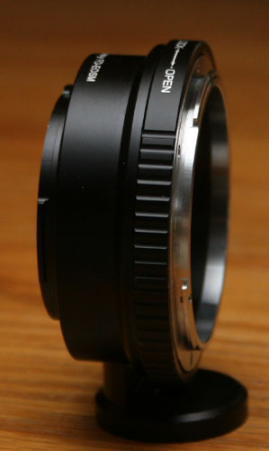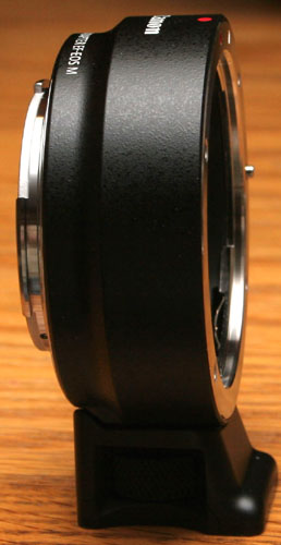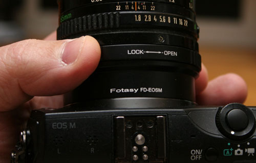 Mounting the adapter is similar to the process of mounting the EF/EF-M unit, though operation is slightly different. With the FD adapter, the camera has no control over the lens, so you must focus and set the aperture manually. You control aperture by setting the aperture ring on the lens, and then turning a stop down ring on the mount. The camera will automatically set the shutter speed to the correct exposure. When you first stop down, the viewfinder dims briefly, but quickly returns to full brightness.