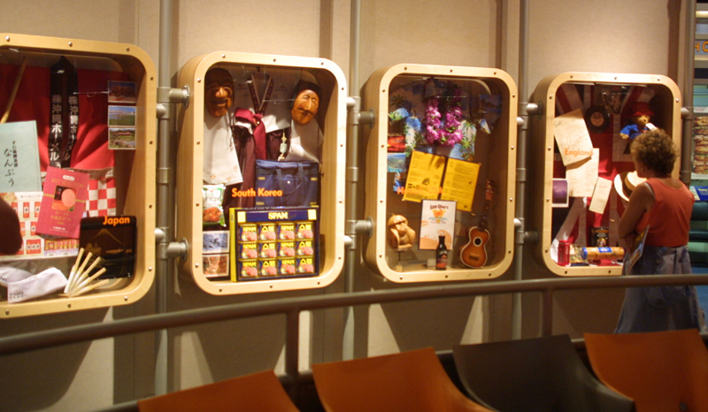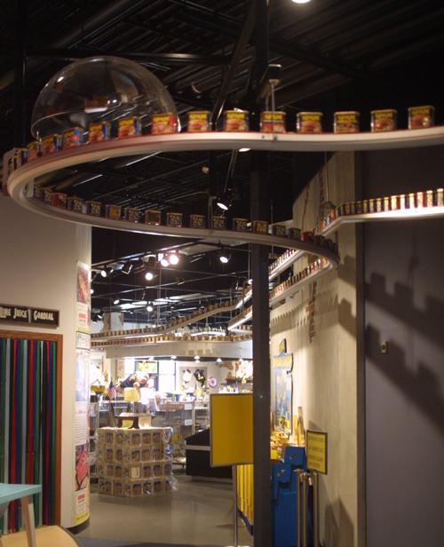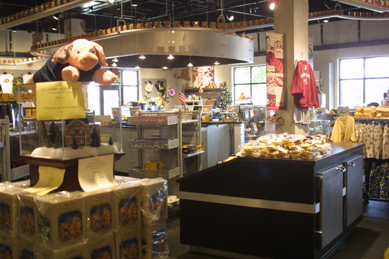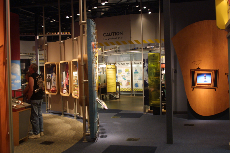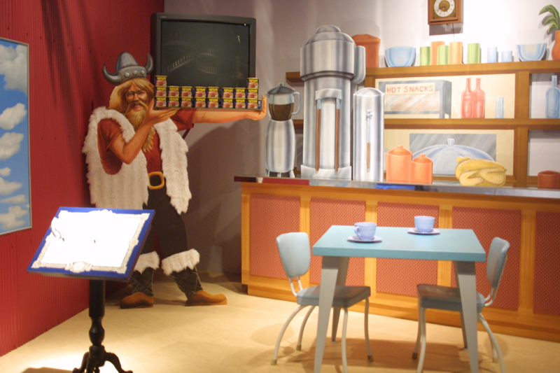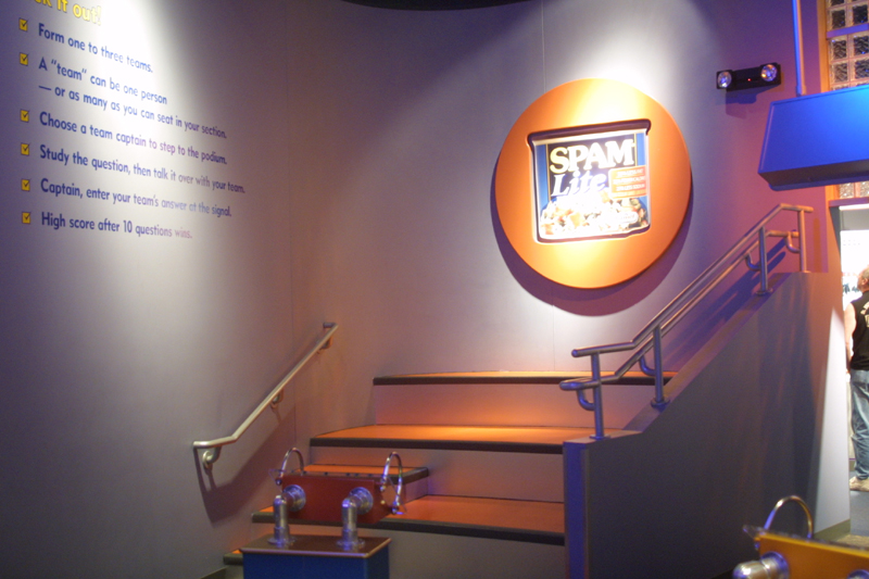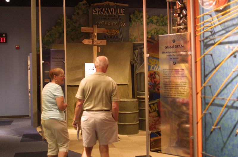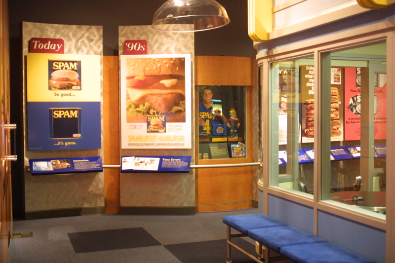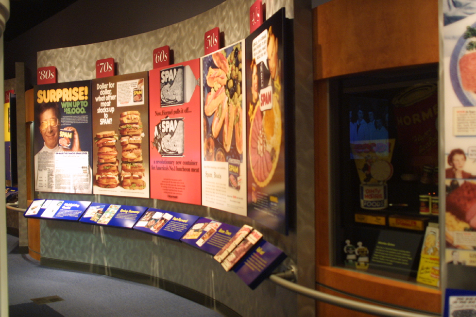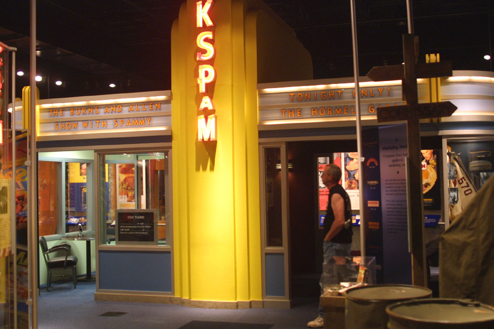 | LEFT: In the Kspam radio studio, you can listen to Spam sponsored radio shows, primarily those of George Burns, and Gracie Allen, as well as Artie Shaw. Needless to say, you will hear many commercials. These are just a few of the earlier cultural contributions made by Spam. BELOW: Some of the other cultural contributions made by Spam. Along with Kool Aid, Wonder Bread, and Tang, Spam has become more than a food, and has been turned into a cultural icon of America. |