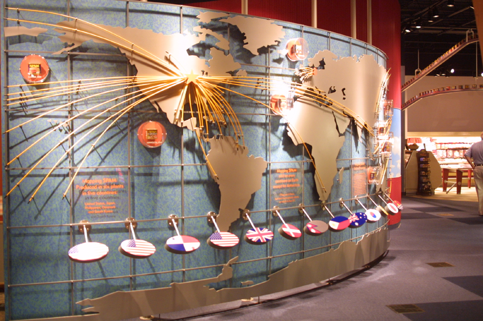 | LEFT: A brief view of Spamville, the 125th fighter squadron. The military consumed incredible quantities of spam. It was often, the only meat available. BELOW: So who eats Spam? The answer seems to be, everyone eats Spam. From it's origin in Austin Minnesota, Spam goes all over the world. |